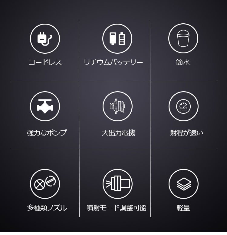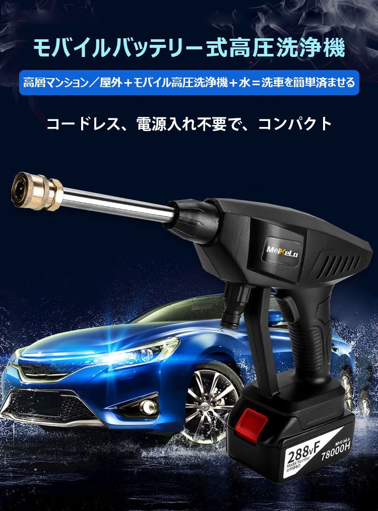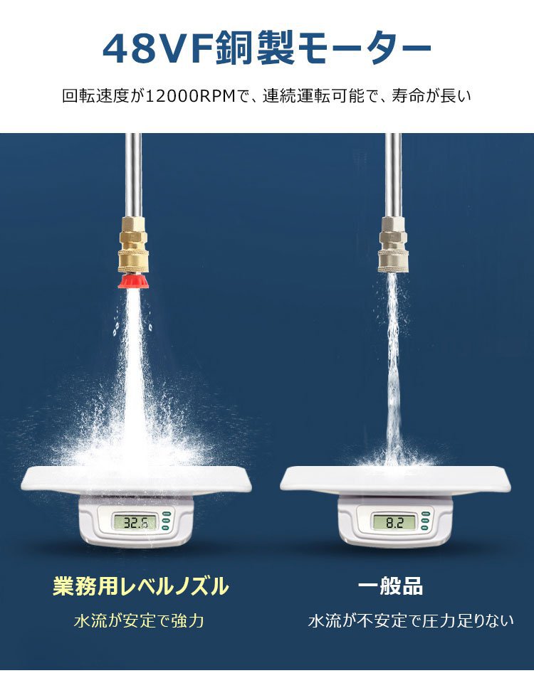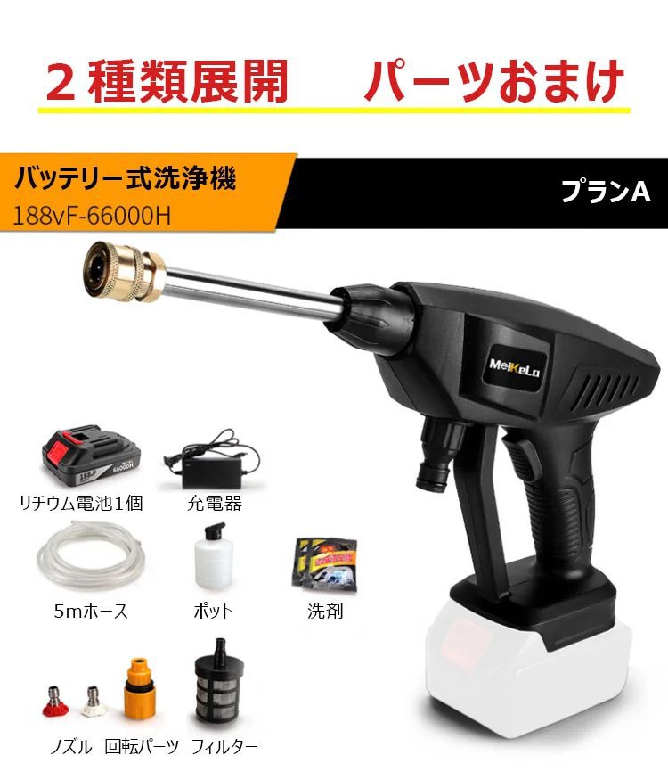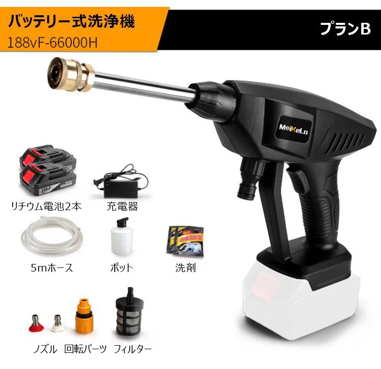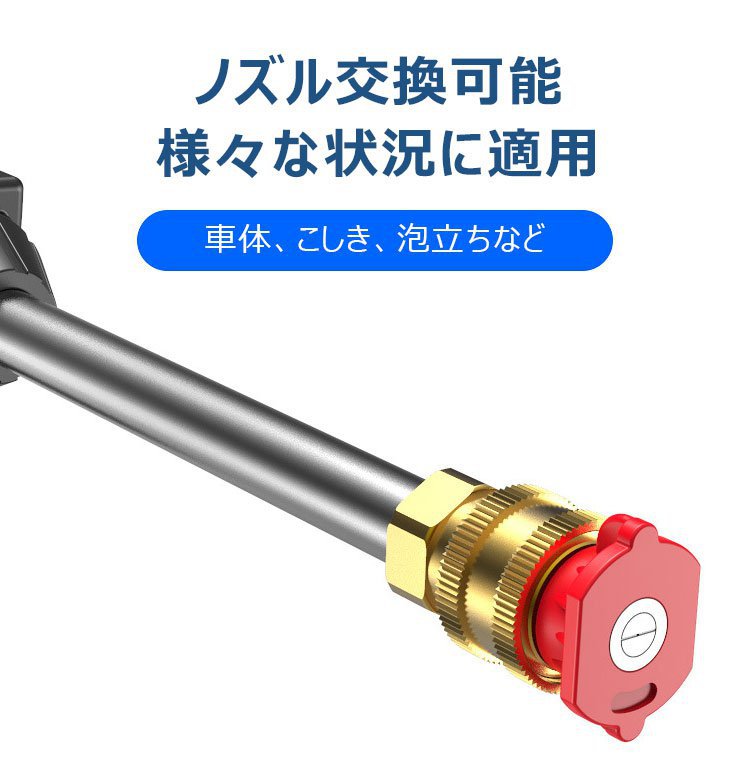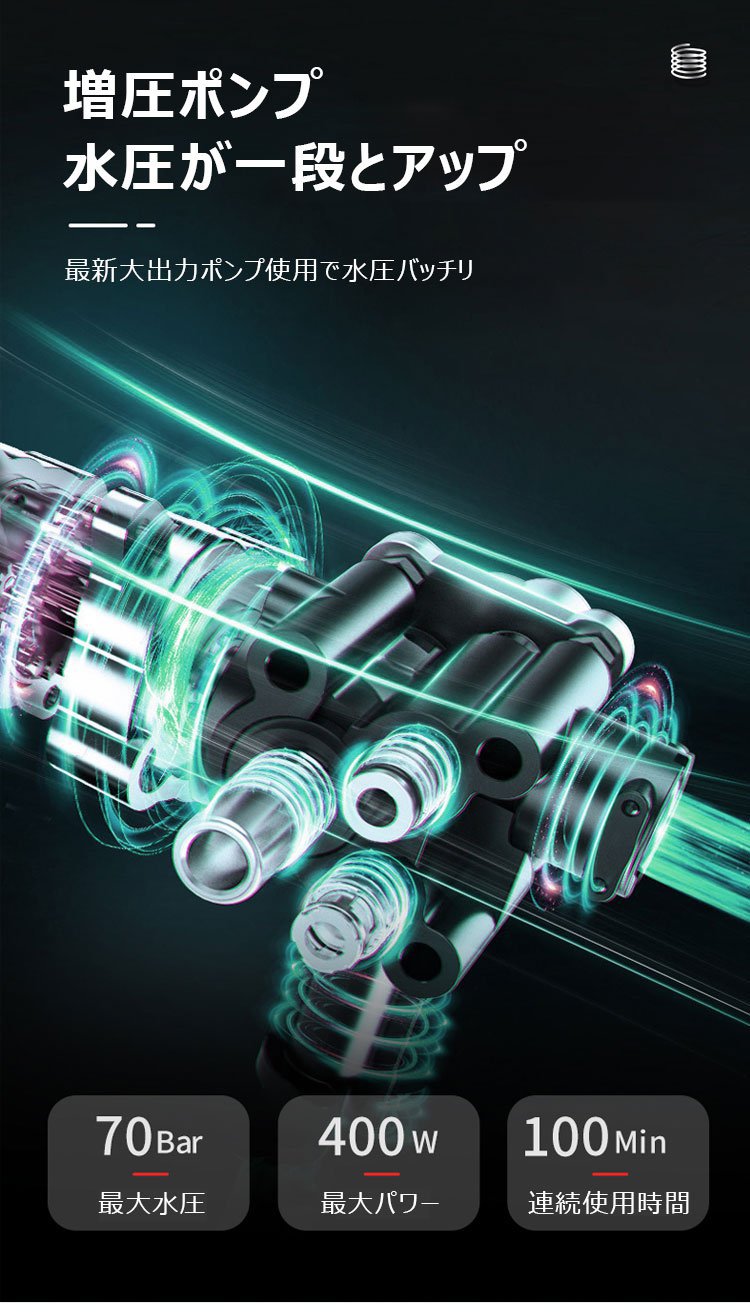 【バッテリー式高圧洗浄機】ターボ増圧、安定、多役、ノズル交換可能、フィルター付き