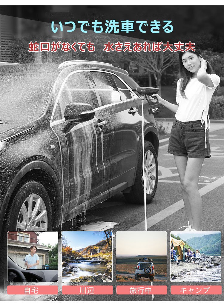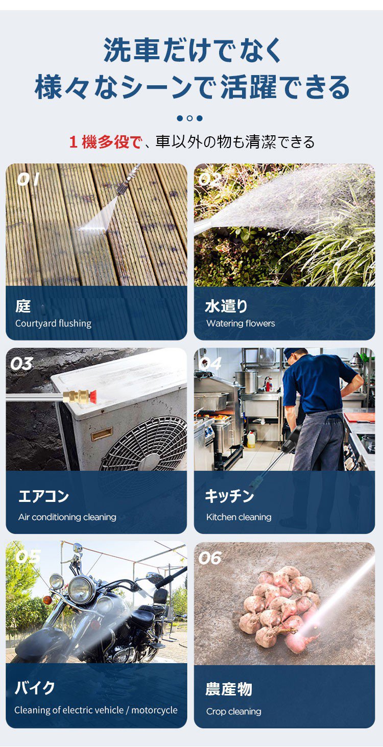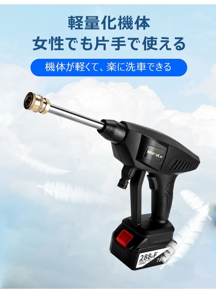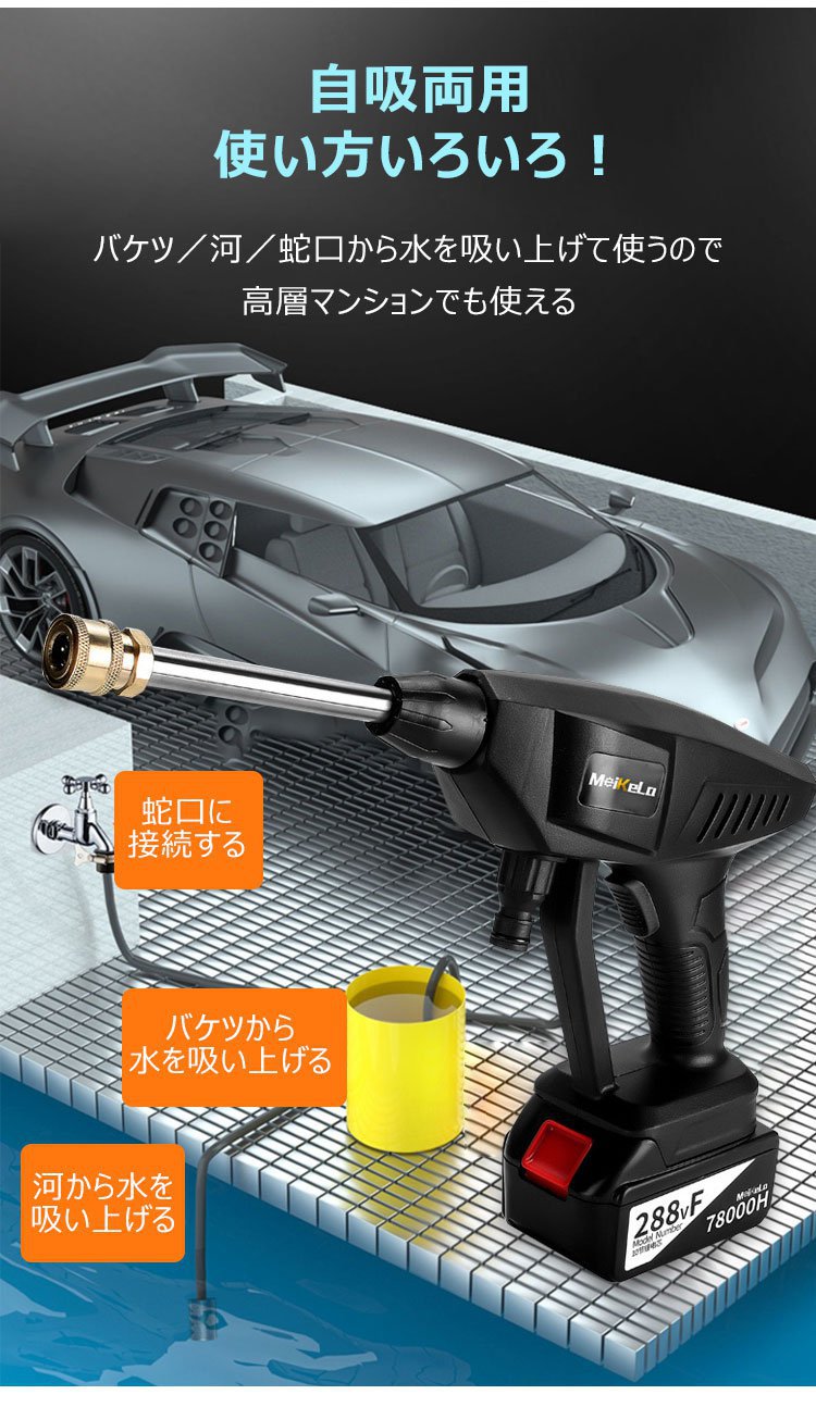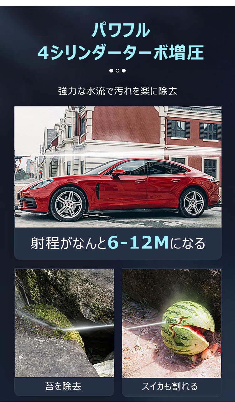 【バッテリー式高圧洗浄機】ターボ増圧、安定、多役、ノズル交換可能、フィルター付き